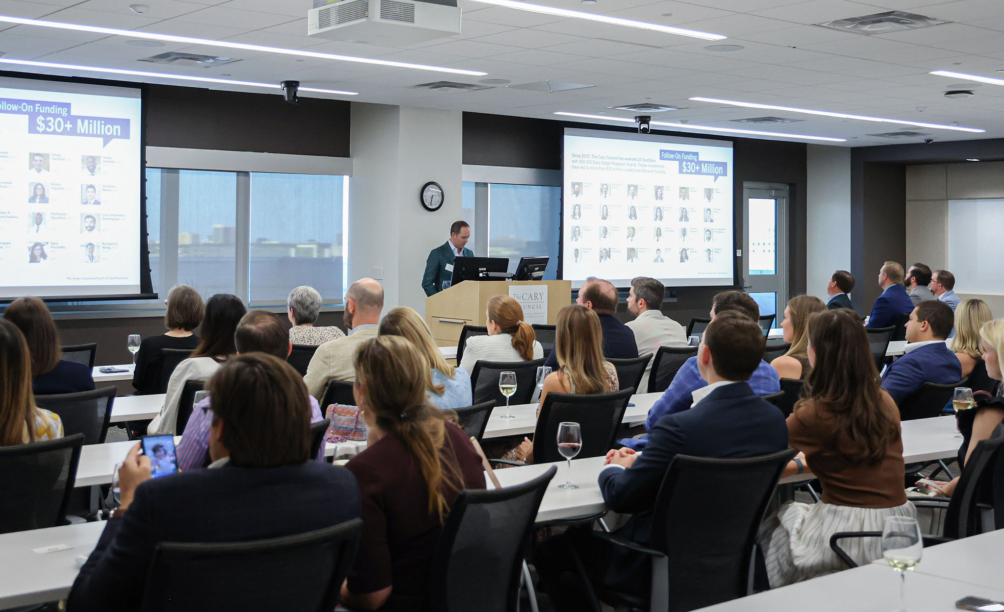 The program opened with welcoming remarks from Jonathan Dietz, Chair of The Cary Council, who celebrated the council’s 10-year anniversary and highlighted the organization’s mission to accelerate early-stage medical research. Since its founding in 2015, The Cary Council has awarded more than $1.2 million in seed funding, fueling the work of 24 researchers we call “DocStars.” Collectively, those investments have been leveraged into more than $30 million in subsequent follow-on funding. Each DocStar receives a $50,000 Early-Stage Research Grant, providing the resources and recognition needed to transform bold ideas into breakthroughs that improve lives.